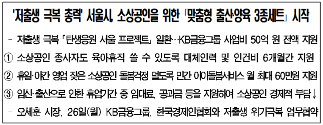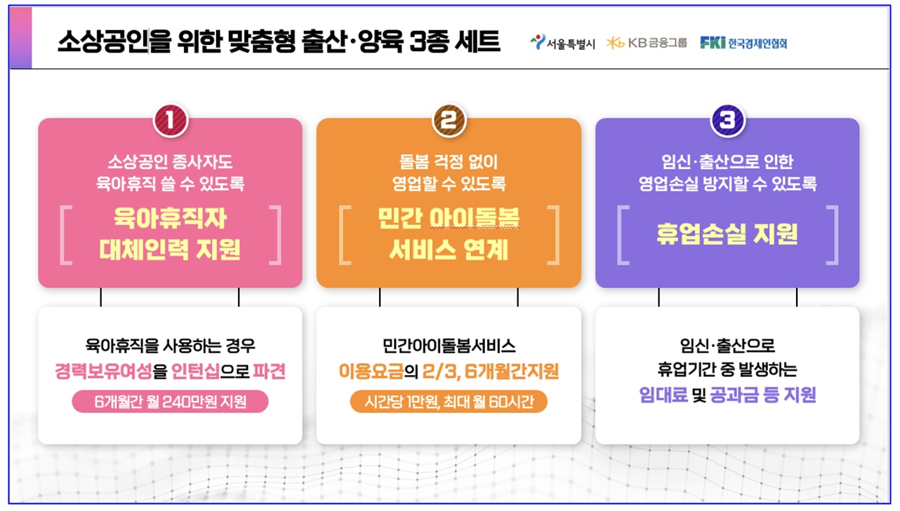 서울시와 KB금융그룹과 한국경제인협회가 공동 추진하는 소상공인을 위한 「맞춤형 출산·양육 3종세트」는 ①육아휴직자 대체인력 지원 ②아이돌봄서비스 연계 ③임신·출산으로 인한 휴업 기간 중 발생하는 임대료, 공과금 등 각종 고정비용을 지원한다고 합니다.
