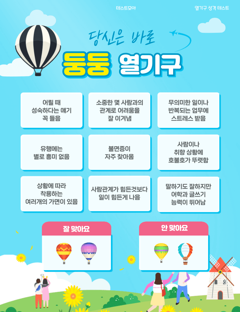 자신과 잘 맞는 열기구와 안 맞는 열기구는 누구인지, 친구와 같이 테스트해보는 테스트모아에서 나온 ‘열기구 성격 테스트’를 소개드리겠습니다.