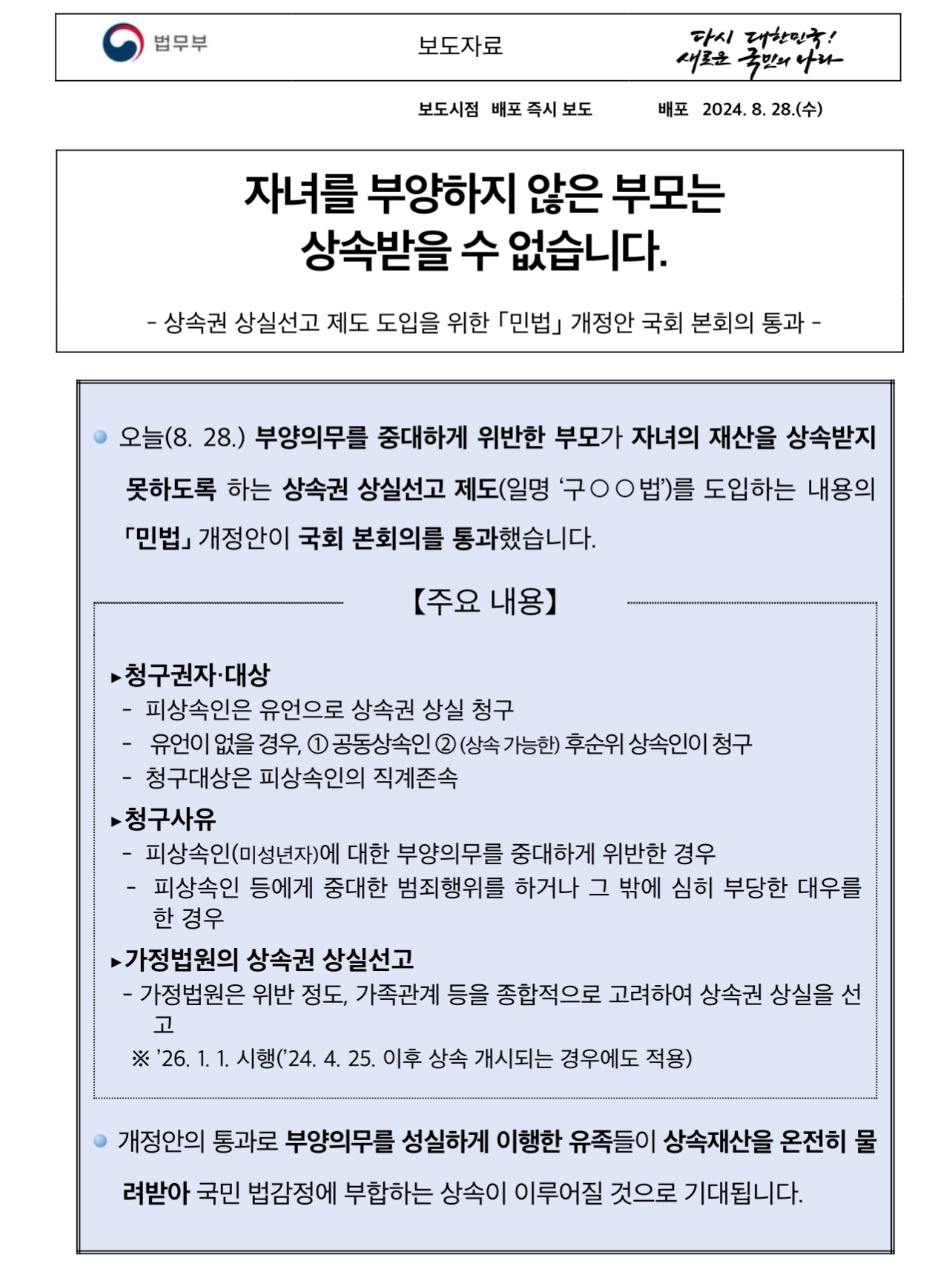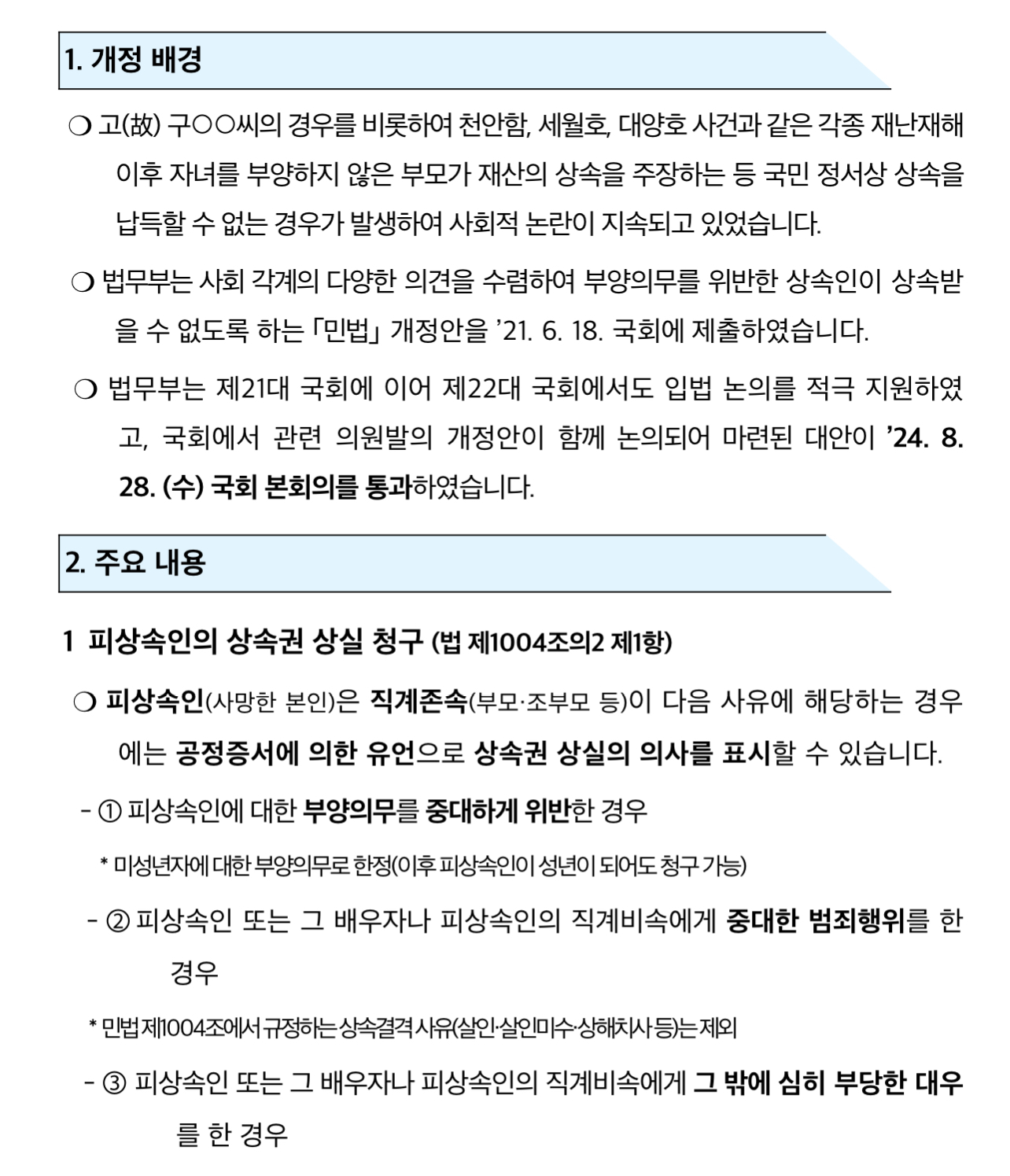 법무부는 개정 배경에 대해 "천안함·세월호·대양호 사건과 같은 각종 재난재해 이후 자녀를 부양하지 않은 부모가 재산의 상속을 주장하는 등 국민 정서상 상속을 납득할 수 없는 경우가 발생해 왔다"라고 설명했습니다.