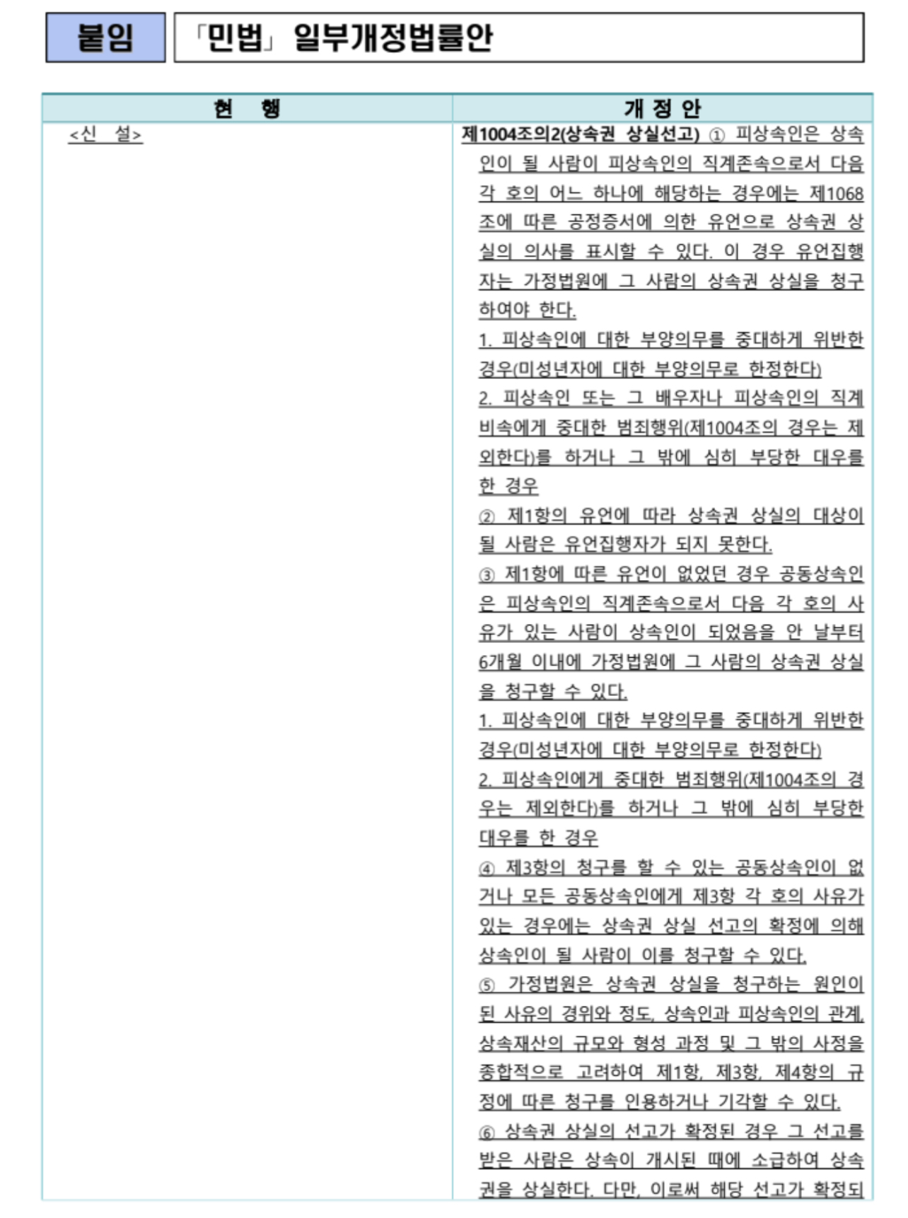 개정안은 피상속인(사망한 자녀 등)에게 부양의무를 다하지 않았거나 학대 등 범죄를 저지른 경우와 같이 상속을 받을 만한 자격이 없는 법정 상속인(부모·조부모 등 직계존속)의 상속권을 제한하는 내용이 골자입니다.
