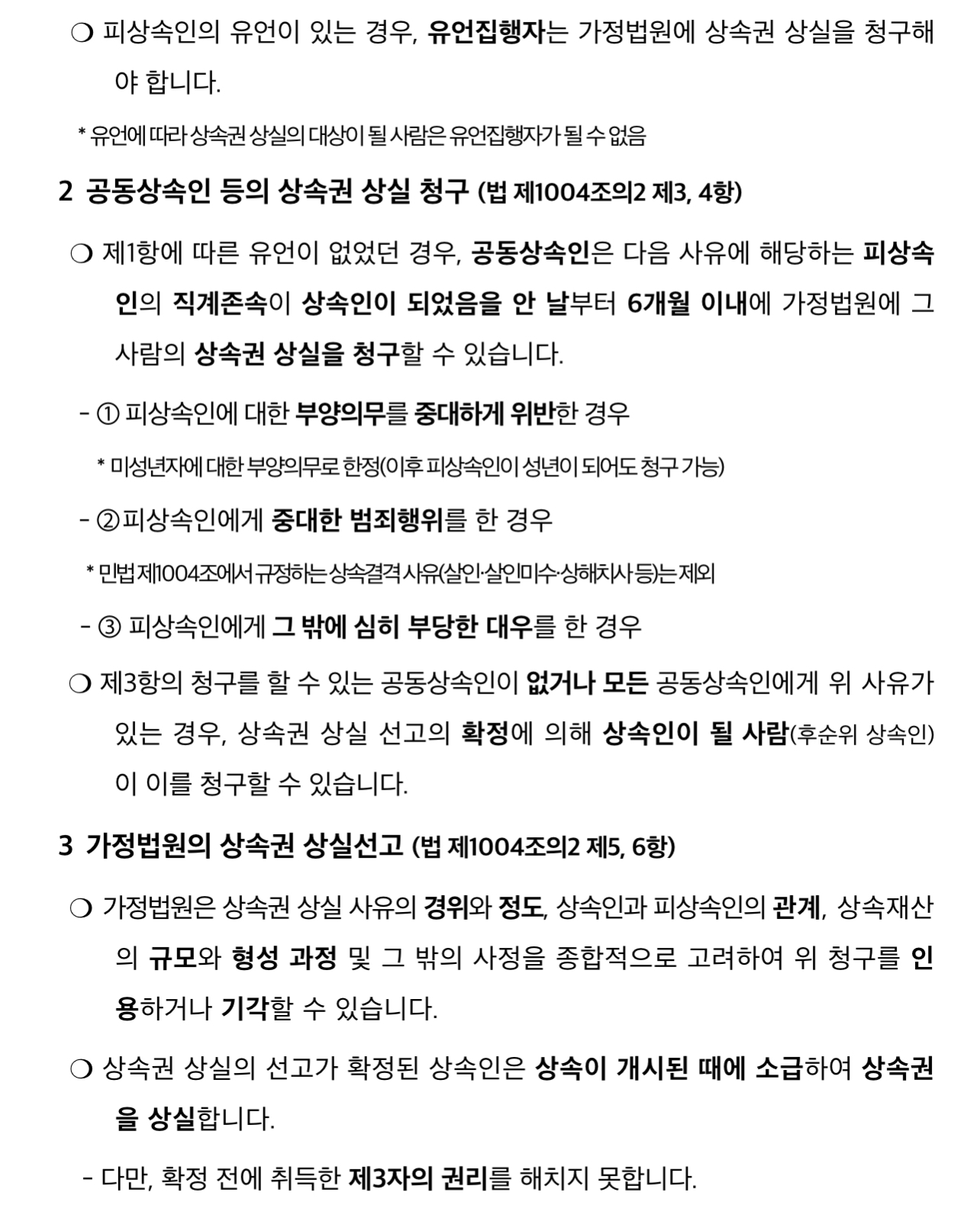 피상속인은 공정증서에 의한 유언으로 상속권 상실을 청구할 수 있으며 피상속인의 유언이 있는 경우 유언집행자는 가정법원에 상속권 상실을 청구해야 합니다.