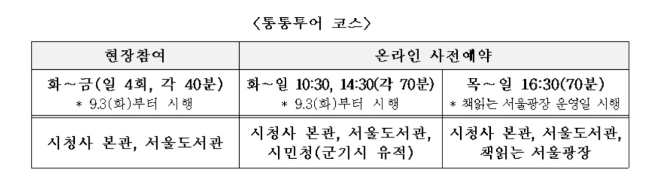 서울시는 2020년 1월 코로나19로 통통투어가 중단되기 이전까지 현장 참여 투어를 진행했지만 2022년 7월 시청사 투어 재개 이후부터는 사전예약제로만 운영해 왔습니다.