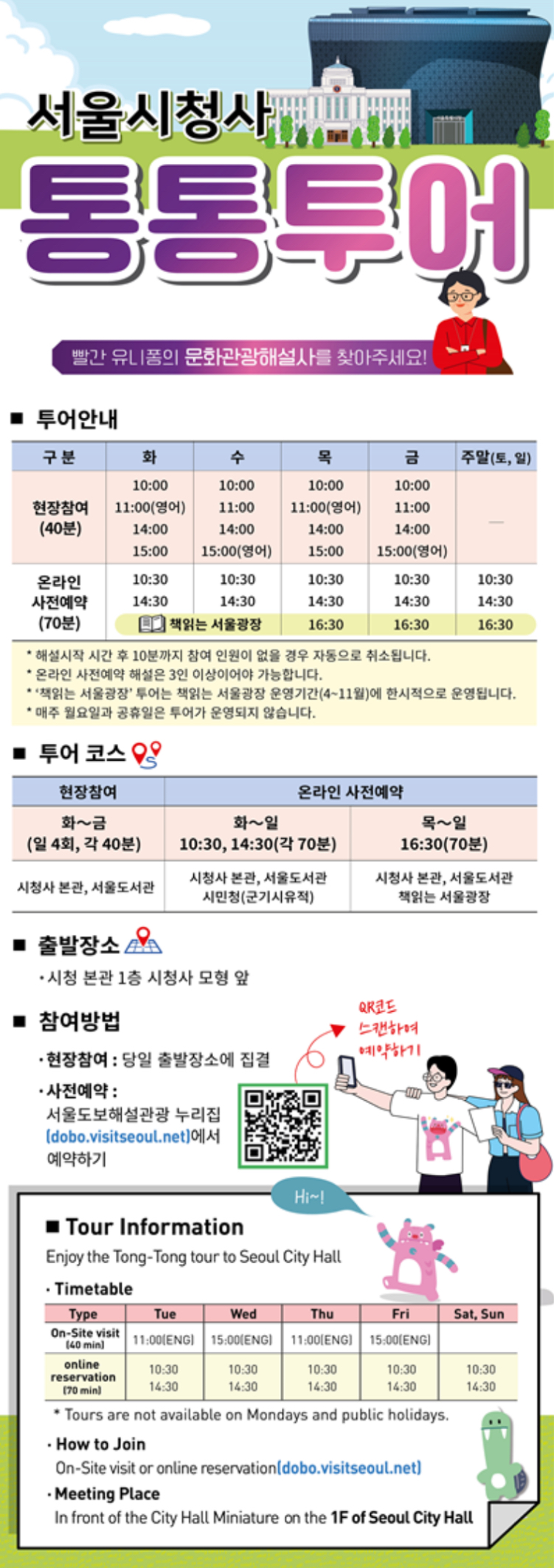 우선, 시청사를 방문하는 시민이나 관광객은 사전예약 없이도 방문 당일 시청 투어 현장참여가 가능합니다.