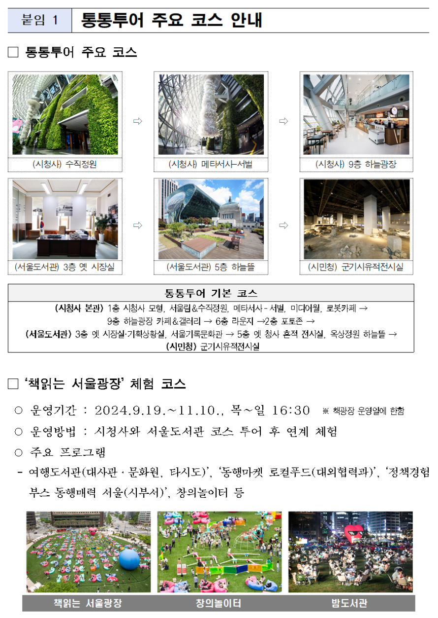 2024년 4월부터 11월 사이 매주 목요일에서 일요일까지 운영하는 ‘책읽는 서울광장’ 기간 중에는 책읽는 서울광장 운영일에 한해 1일 1회 사전예약으로 시청사와 서울도서관 코스 외 ‘책읽는 서울광장’ 체험 코스도 추가하여 투어를 진행합니다.