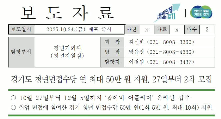 경기도와 경기도미래세대재단이 2025년 10월 27일부터 12월 5일까지 2025년 청년 면접수당 2차 모집을 진행한다고 밝혔습니다.