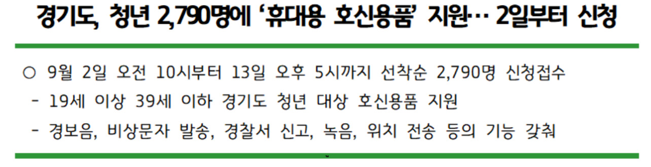 경기도가 스토킹, 묻지 마 범죄 등 각종 위험 상황에 닥쳤을 때 버튼만 누르면 경보음이 울리거나 경찰서 신고 등을 할 수 있는 휴대용 호신용품을 도내 청년들에게 무료 지원하기로 하고 2024년 9월 2일부터 13일까지 신청자를 모집한다고 합니다.