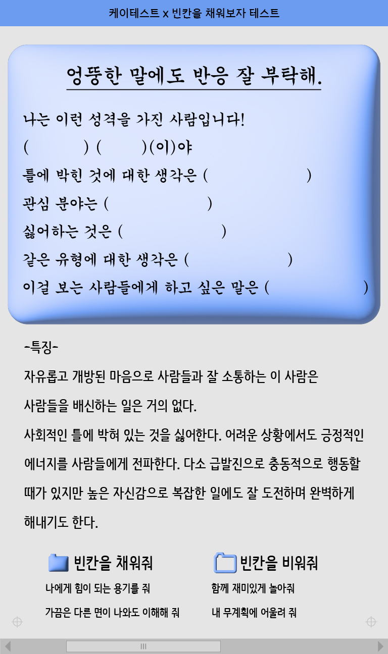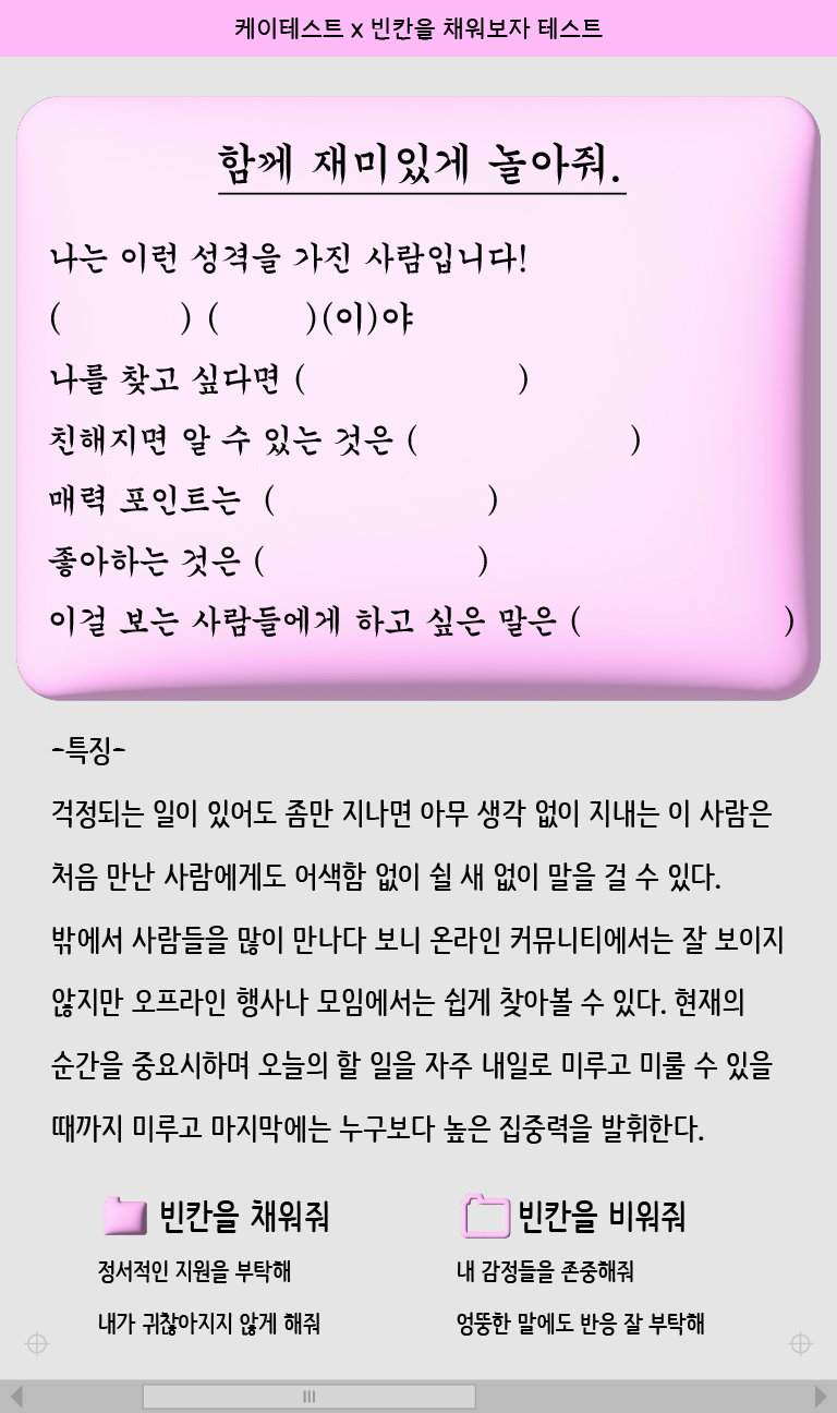 빈칸을 채우고 나를 소개해 주고 싶은 사람에게 공유해보는 케이테스트에서 나온 ‘빈칸을 채워보자 테스트’를 소개드리겠습니다.