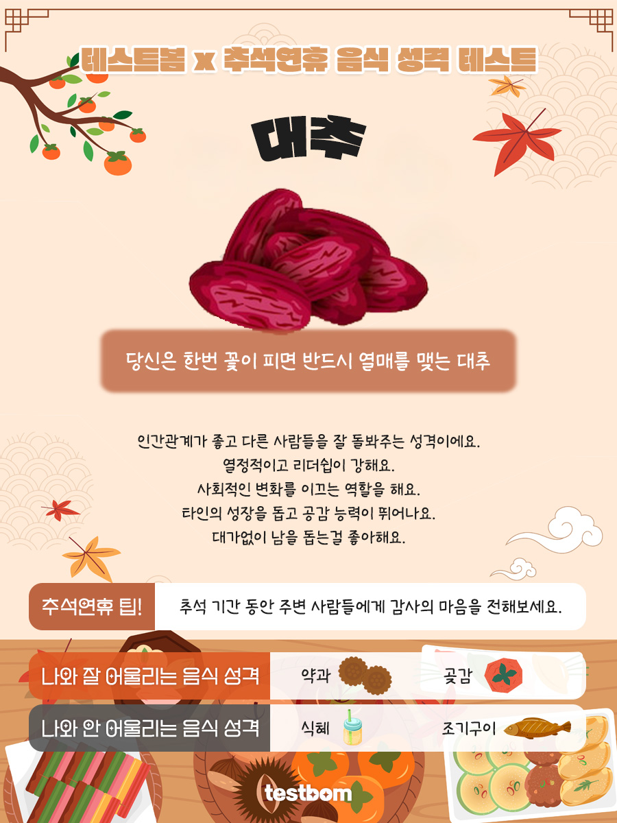 동그랑땡, 송편, 부침개 등 16가지 추석 음식으로 알아보는 성격 테스트가 있는데 테스트봄에서 나온 ‘추석 연휴 음식 성격 테스트’를 통해서 나와 잘 어울리는 음식도 함께 알아보시길 바랍니다.