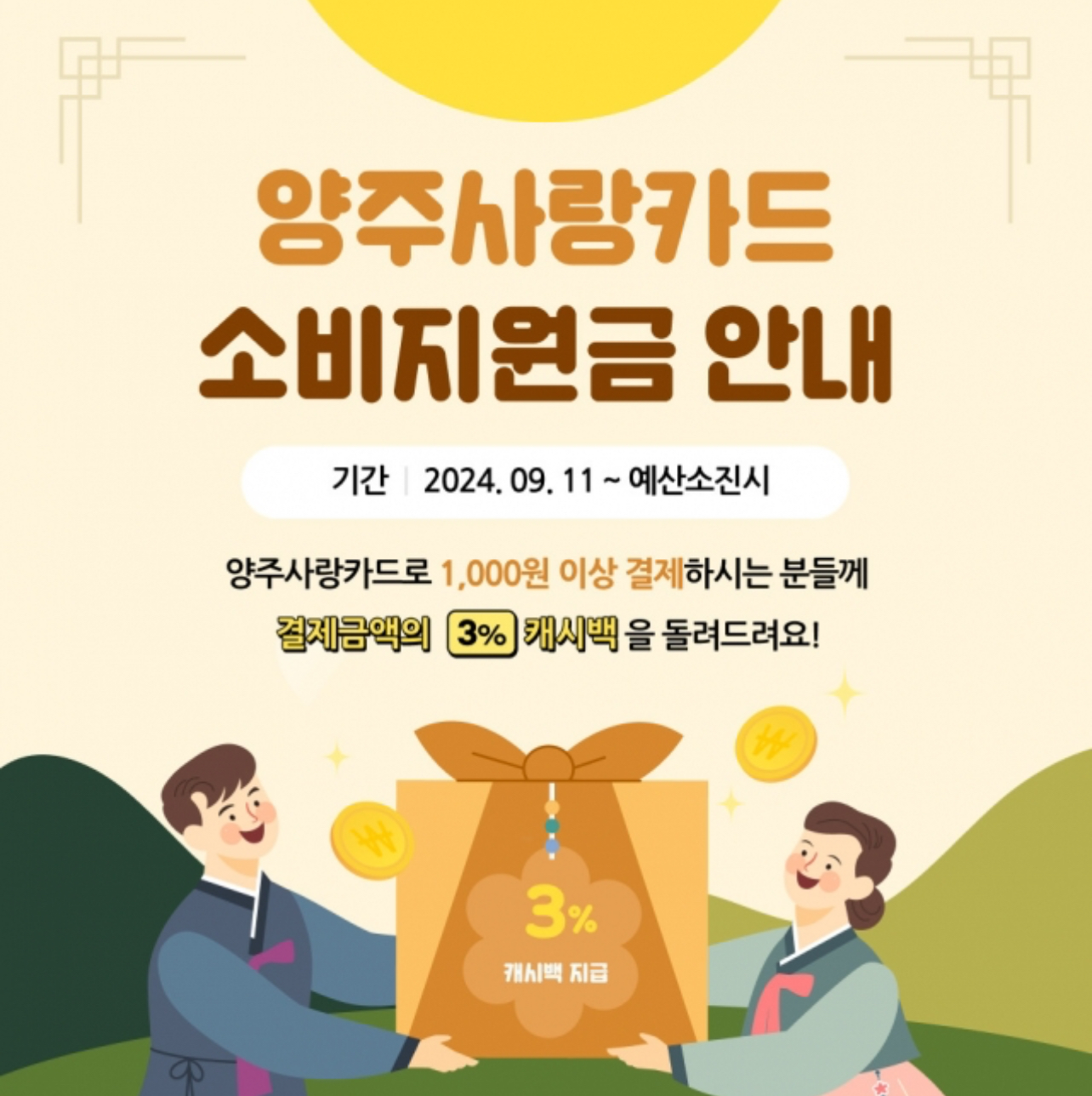 이번 행사는 양주사랑상품권 충전 시 지급되는 10% 인센티브 지급과는 별개로 오는 2024년 9월 11일부터 8400여개의 가맹점에서 양주사랑상품권 결제 시 3% 환급 혜택을 주는 이벤트이며 이번 행사는 예산소진 시까지 진행할 예정이라고 합니다.