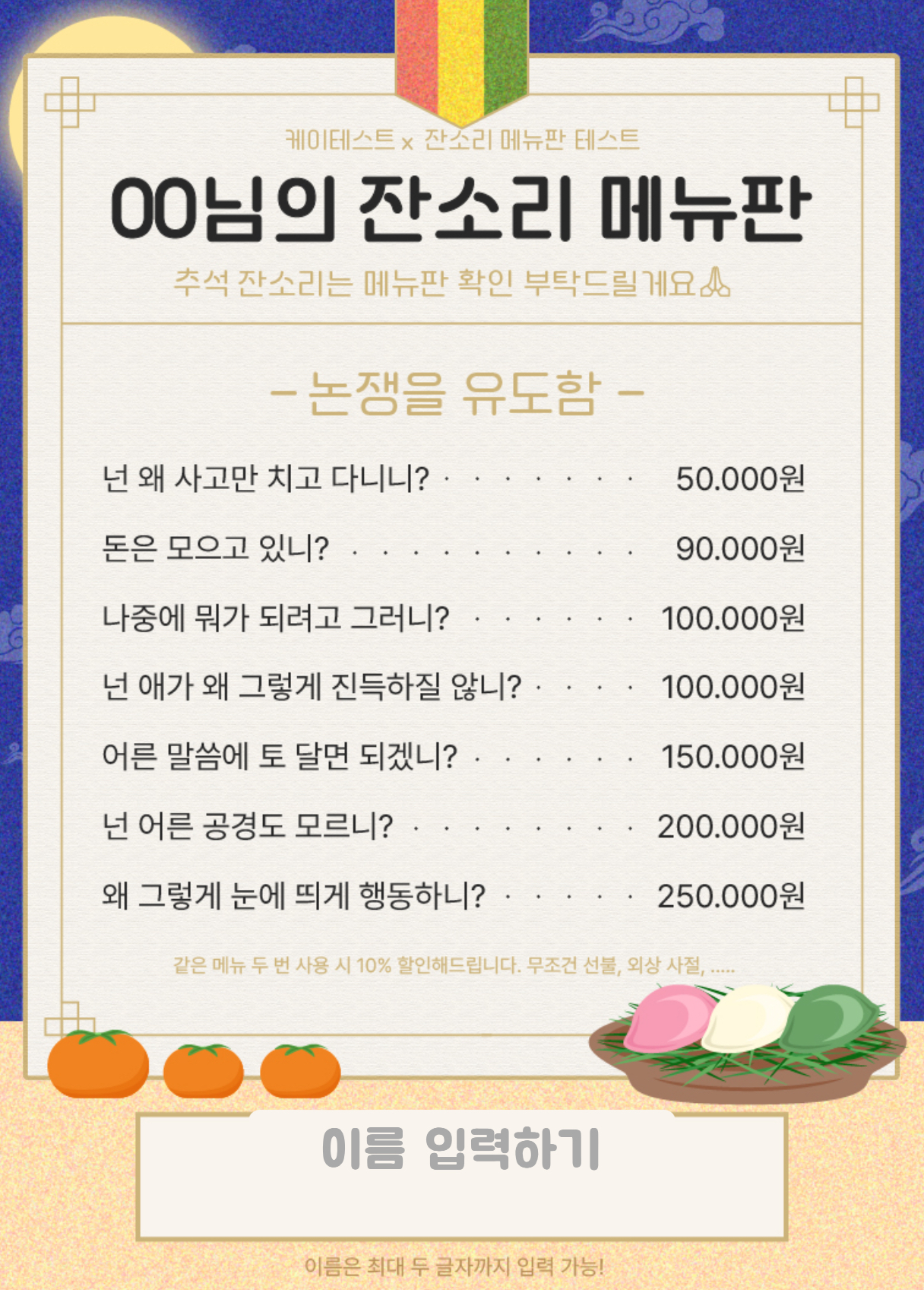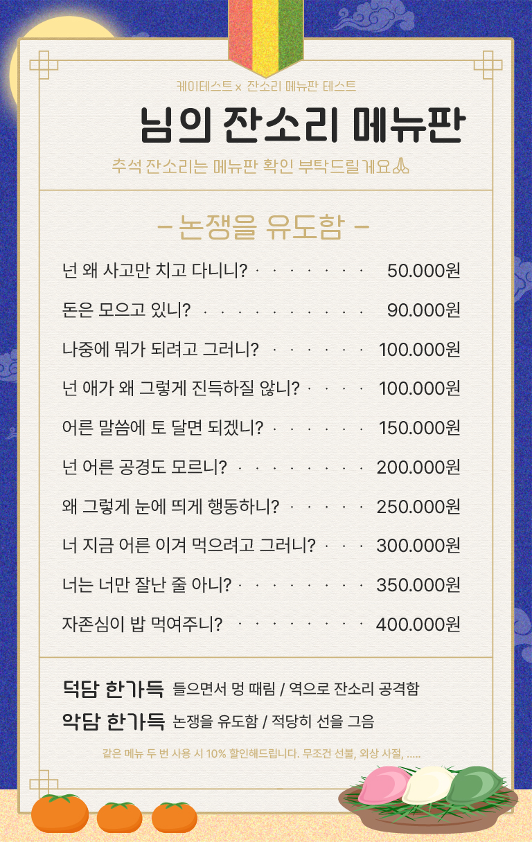 추석 잔소리를 메뉴판으로 확인해보는 케이테스트에서 나온 ‘잔소리 메뉴판 테스트’를 소개드리겠습니다.