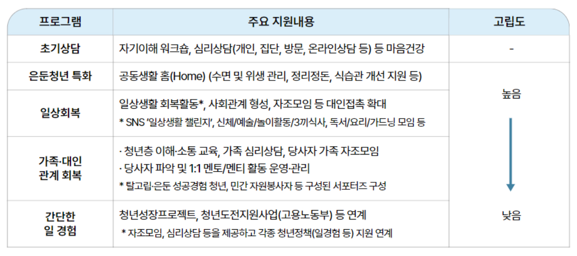 상담 결과 지원이 필요한 것으로 판단되면 전문인력이 청년의 프로그램 참여 의지, 고립도 수준 등을 고려하여 지원계획을 수립하고 자조모임·일상회복·공동생활 합숙 등 맞춤형 프로그램을 운영 및 제공한다고 합니다.