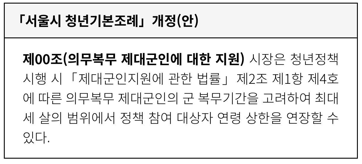 20대 초중반 청년들은 군 의무 복무하는 기간 동안 ‘청년정책’ 혜택의 사각지대에 놓여 사회적 경험과 기회를 충분히 얻지 못하는 만큼 서울시는 청년 제대군인의 권익을 보호하고 고른 정책 참여의 기회를 제공하기 위해 조례 개정을 준비해 왔습니다.