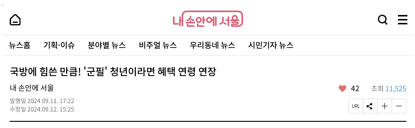 서울시는 군 의무 복무기간만큼 시 청년정책 지원 연령을 상향하여 지원하기 위한 근거를 마련하고자 ‘서울특별시 청년 기본 조례’ 개정을 추진한다고 밝혔습니다.
