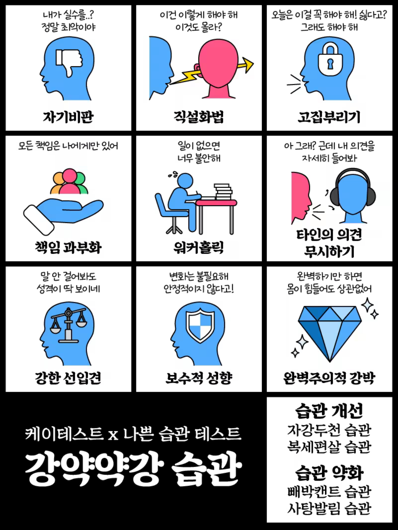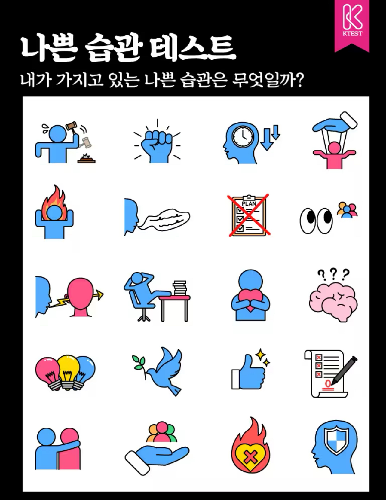 내가 가지고 있는 나쁜 습관은 무엇일지 알아보는 케이테스트에서 나온 ‘나쁜 습관 테스트’를 소개드리겠습니다.