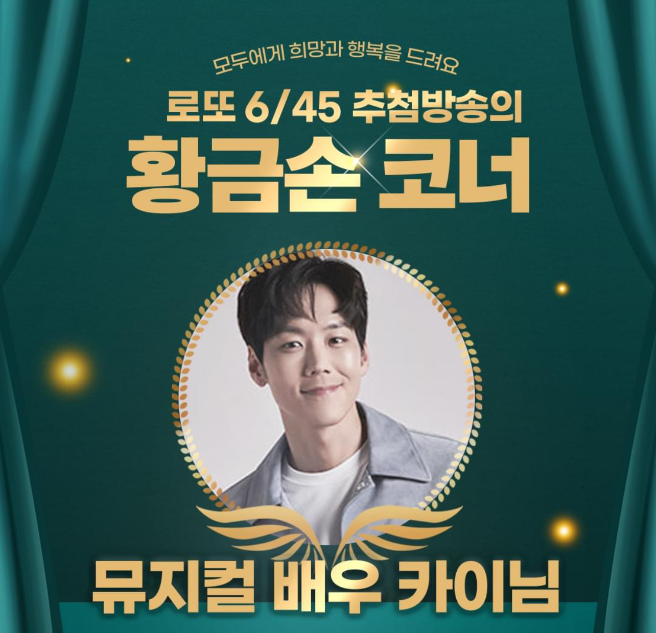 뮤지컬 배우 카이가 MBC '생방송 행복드림 로또 6/45'에 황금손으로 출연했습니다.