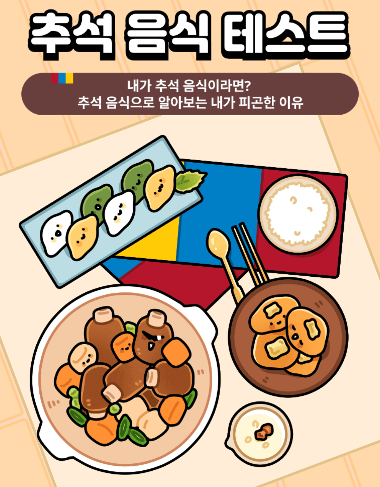 가지각색 이유로 피곤해하는 추석 음식들 중, 나와 닮은 음식은 뭘지 알아보는 푸망에서 나온 ‘푸망 추석 음식 테스트’를 소개드리겠습니다.