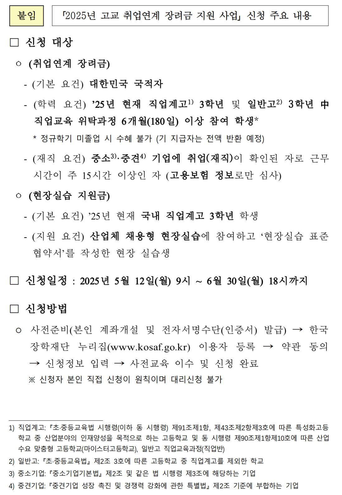 교육부(부총리 겸 교육부 장관 이주호)와 한국장학재단(이사장 배병일)은 고졸 기술기능인재의 중소·중견기업 취업 활성화를 위해 2025학년도 고교 취업연계 장려금 지원 사업의 신청을 시작한다고 공고하였습니다.