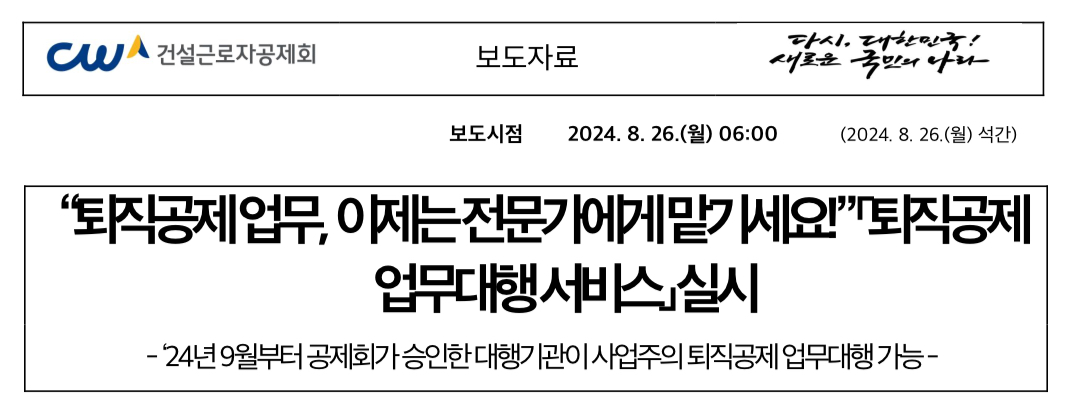 본 설명은 건설근로자공제회 보도자료 출처를 기반으로 작성되었으며 한편, 퇴직공제 업무대행 서비스에 대한 자세한 내용은 건설근로자공제회 홈페이지(cw.or.kr) 공지사항에서 확인할 수 있습니다.