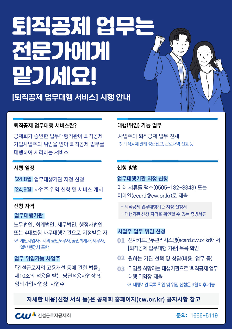 건설근로자공제회(이사장 김상인, 이하 ‘공제회’)는 퇴직공제 업무에 익숙지 않은 중·소규모 사업주의 업무지원 및 경감을 위해 2024년 9월부터 ‘퇴직공제 업무대행 서비스’를 실시한다고 밝혔습니다.