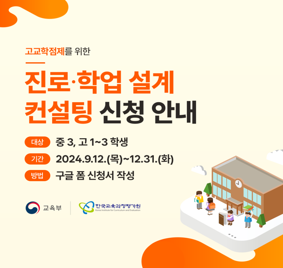 교육부는 2024년 9월 12일(목)부터 올해 12월까지 전국의 중학교 3학년 학생과 고등학생을 대상으로 ‘진로·학업 설계 컨설팅’을 시범 운영한다고 밝혔습니다.