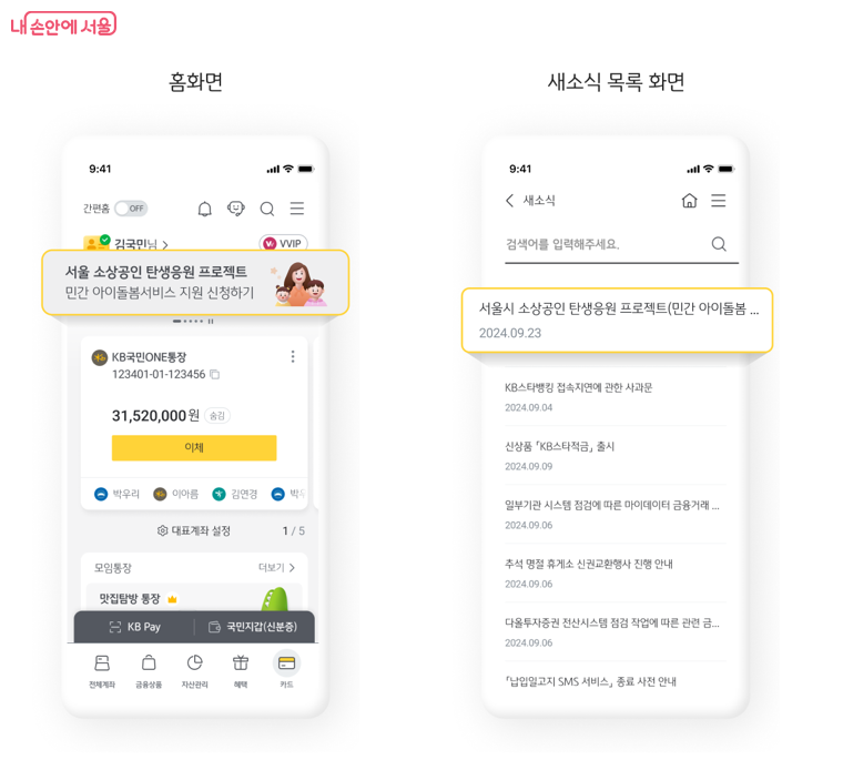 서울시 소상공인 아이돌봄서비스 지원 신청은 모바일 KB스타뱅킹 앱(구글플레이, 앱스토어)으로만 할 수 있으며 약 4주간의 서류접수 및 심사를 거쳐 대상자를 최종 선정하고 서비스를 개시한다며 선정결과는 개별 문자메시지로 통보 예정이라고 합니다.