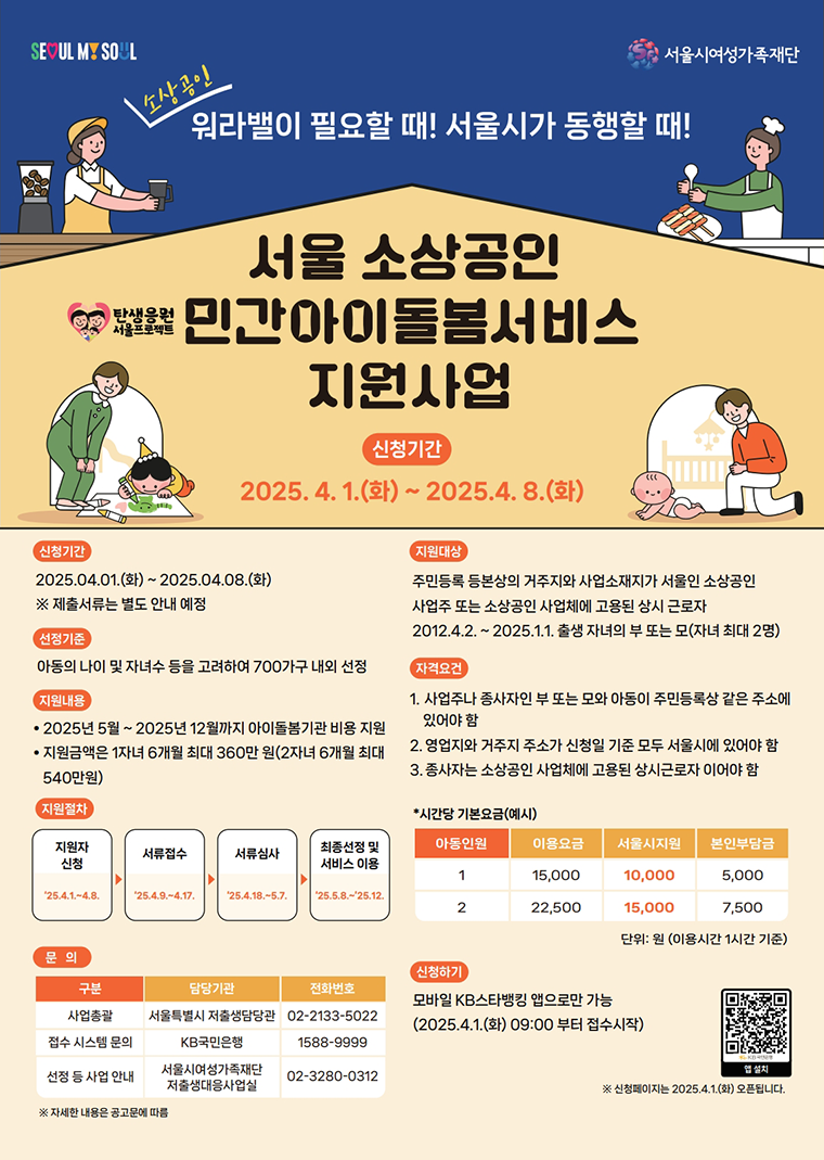 경기 침체와 물가 상승으로 소상공인들의 어려움이 커지는 가운데, 서울시는 소상공인 사업주와 종사자 대상으로 추진하고 있는 ‘소상공인 민간 아이돌봄서비스 지원사업’의 자격요건을 대폭 완화해 지원을 확대한다고 합니다.