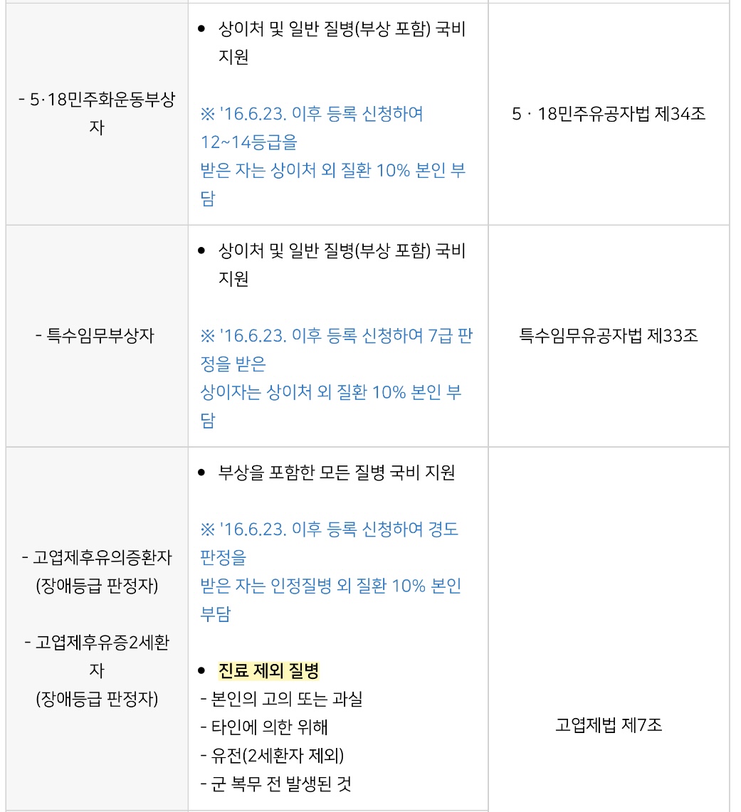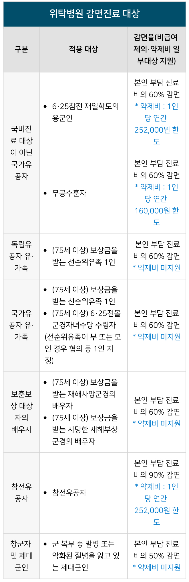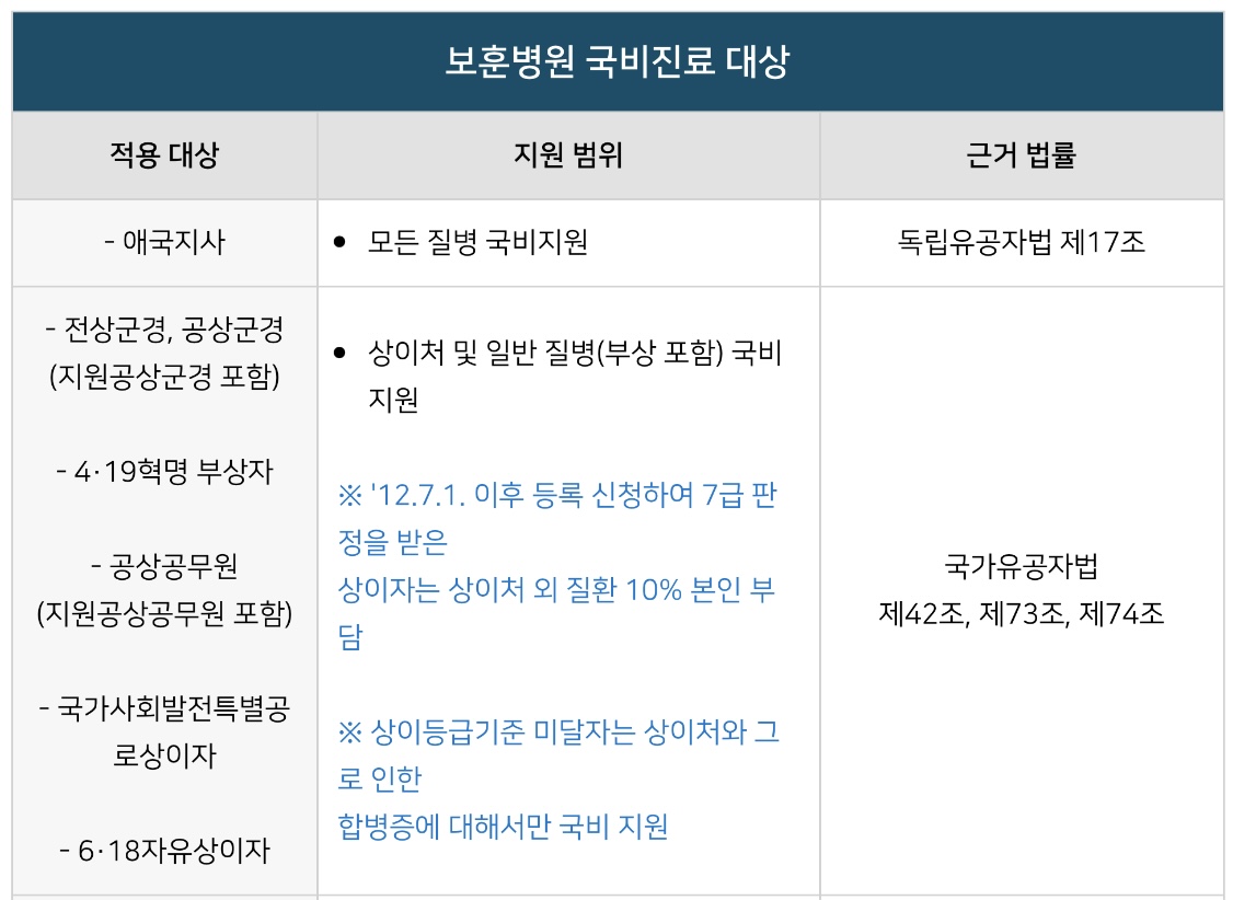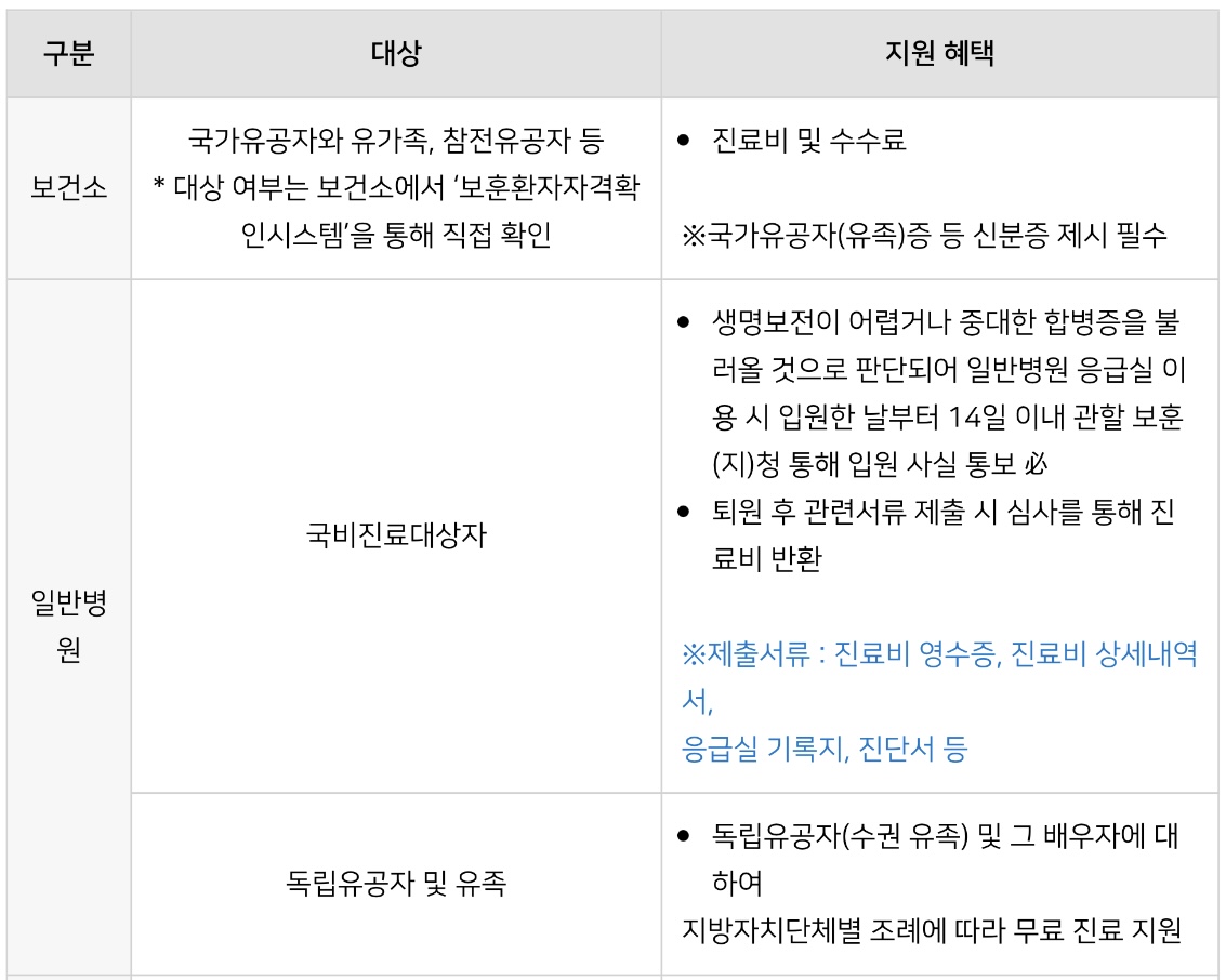 이에 병원별•보훈대상자별 의료 지원 혜택에 대해서 안내드리겠습니다.