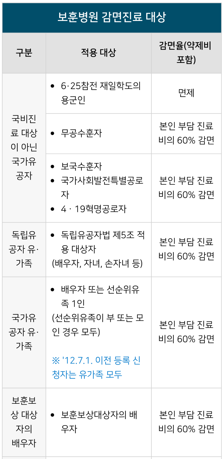 보훈병원 감면대상 및 감면율