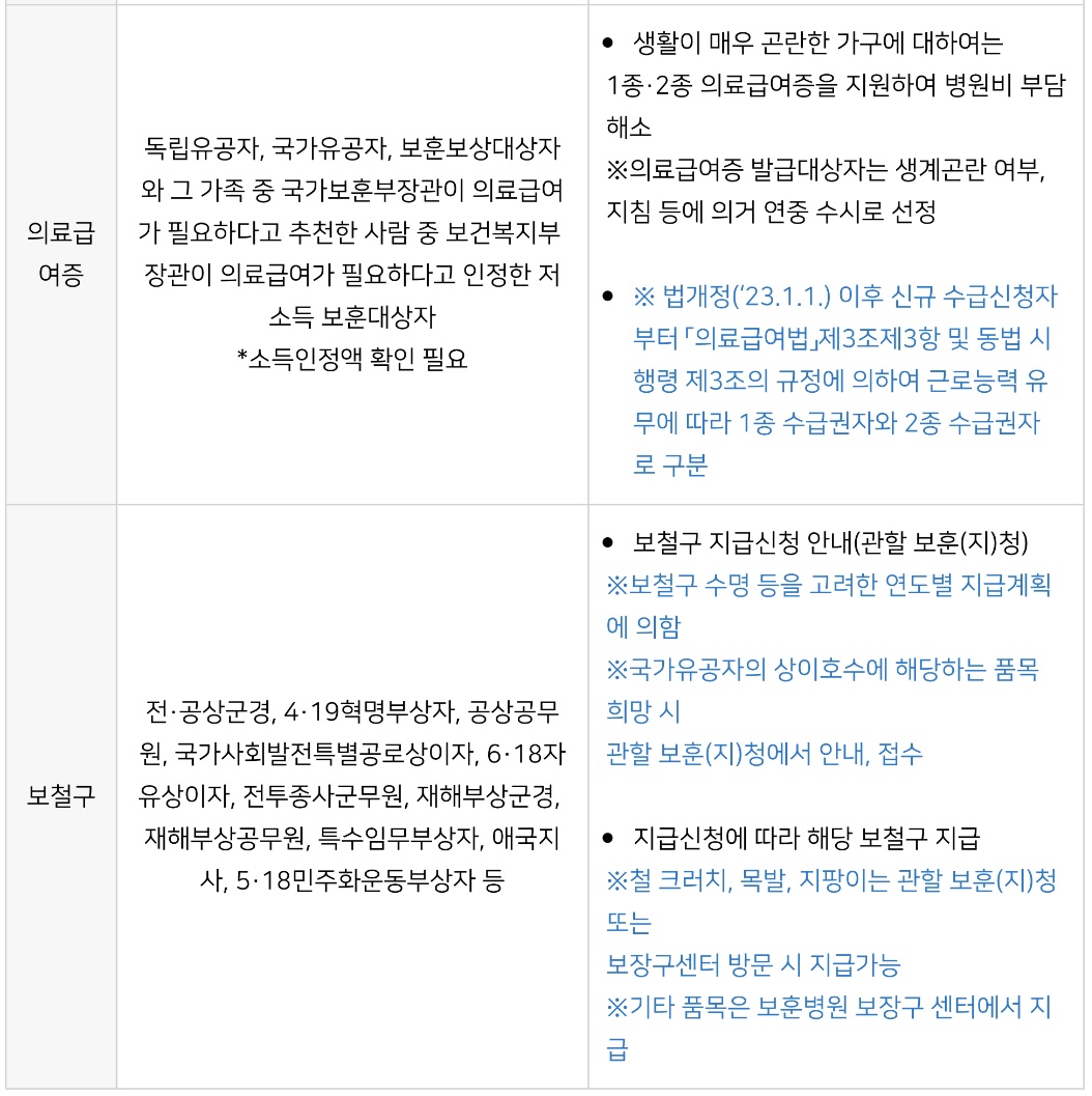 또한 저소득 보훈가족의 의료비 부담을 덜어드리기 위해 1 종 의료급여증을 지원하고 상이로 인한 '관련 보철구' 지급 대상자분들에게는 관할보훈(지)청을 통해 보철구를 지급해드리고 있습니다.