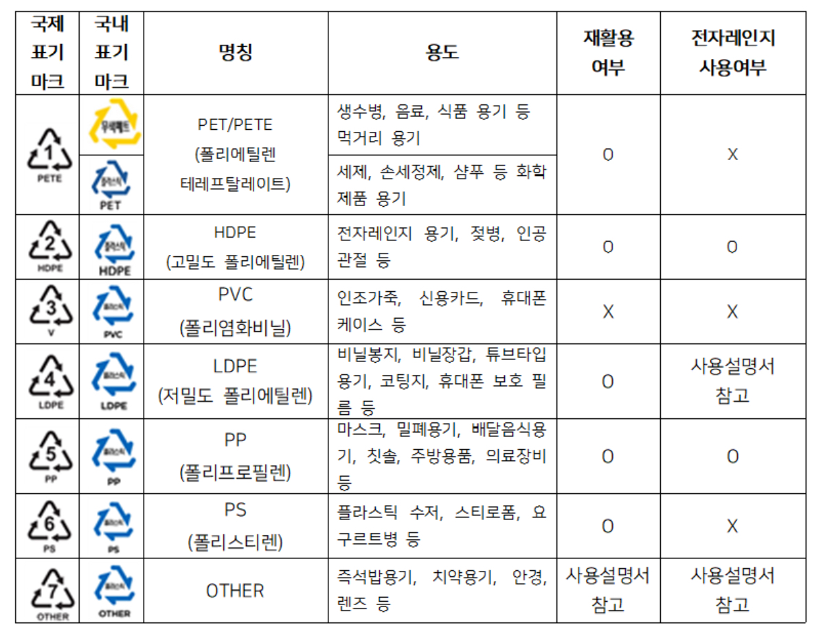 전자레인지용 플라스틱에 대해 알아보기 전, 플라스틱 재활용 마크에 대해 살펴보면 국내에서 사용하고 있는 플라스틱 재활용 마크는 국제표준마크와 국내표준마크가 있습니다.