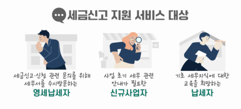 세금신고 지원서비스란 세무대리인을 선임할 여유가 없고 세금(전자)신고 방법을 모르는 납세자가 원활한 납세의무를 이행할 수 있도록 하는 신고 상담서비스입니다.