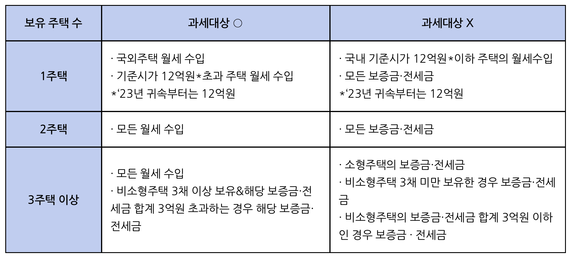 3주택 이상 보유자의 경우 월세와 보증금 등 간주임대료 수입 모두 과세됩니다.