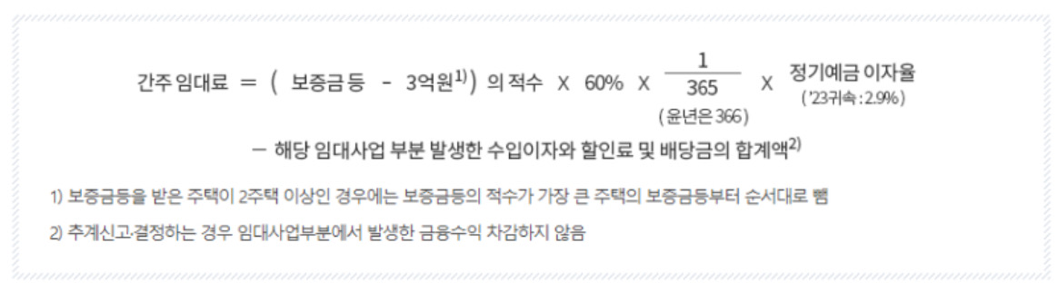 3주택 이상을 소유하고 전세계약 등으로 인하여 보증금 등을 받은 경우 해당 주택의 보증금 등의 합계액이 3억원을 초과하는 경우 간주임대료를 총수입금액에 산입 합니다.