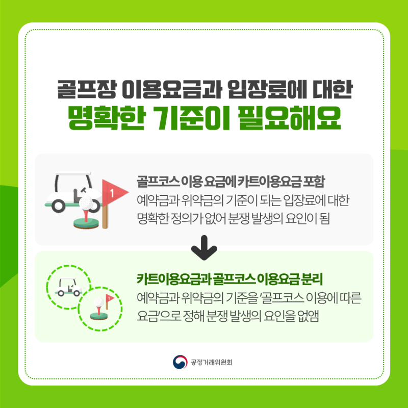 이에 따라 공정거래위원회는 골프장 사업자단체와 표준 약관 개선방안을 협의해 관련 사업자 단체에게 표준 약관 개정 심사를 청구하도록 권고했다고 합니다.