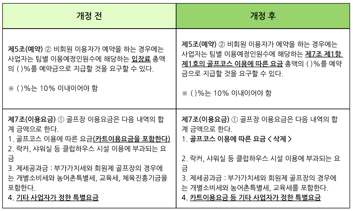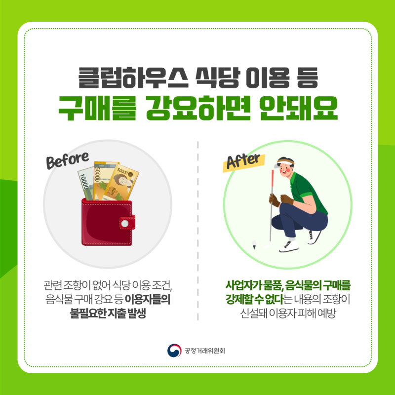 기존에는 관련 조항이 없어 골프장 사업자가 이용자에게 클럽하우스 식당을 이용하는 조건으로 예약을 받거나 물품이나 음식물 등의 구매를 강요해 이용자들에게 불필요한 지출을 강요할 수 있었습니다.