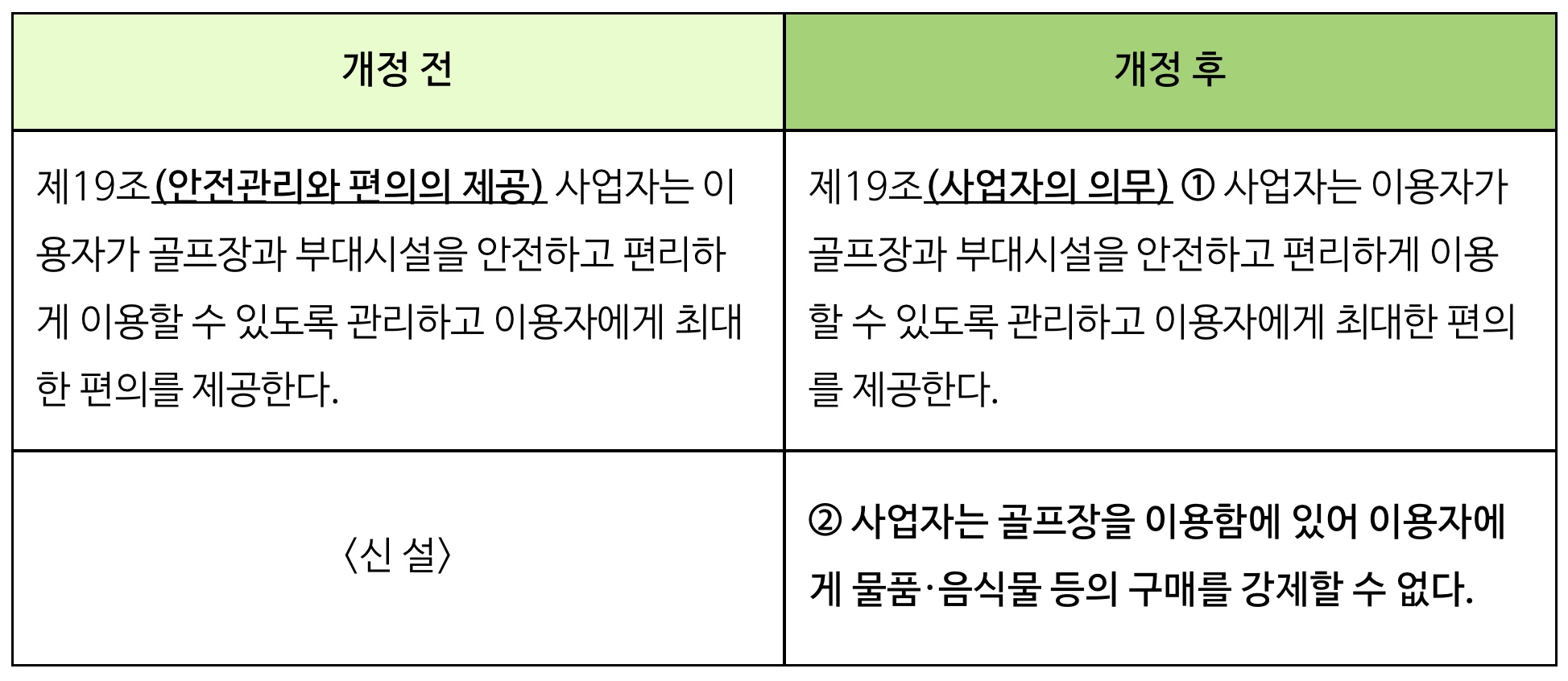 이에 앞으로는 골프코스 이용 외에 물품, 음식물 등의 구매를 강제할 수 없다는 사업자 의무조항을 신설해 소비자의 선택권을 보장하고 소비자 피해를 예방할 수 있게 되었다고 합니다.