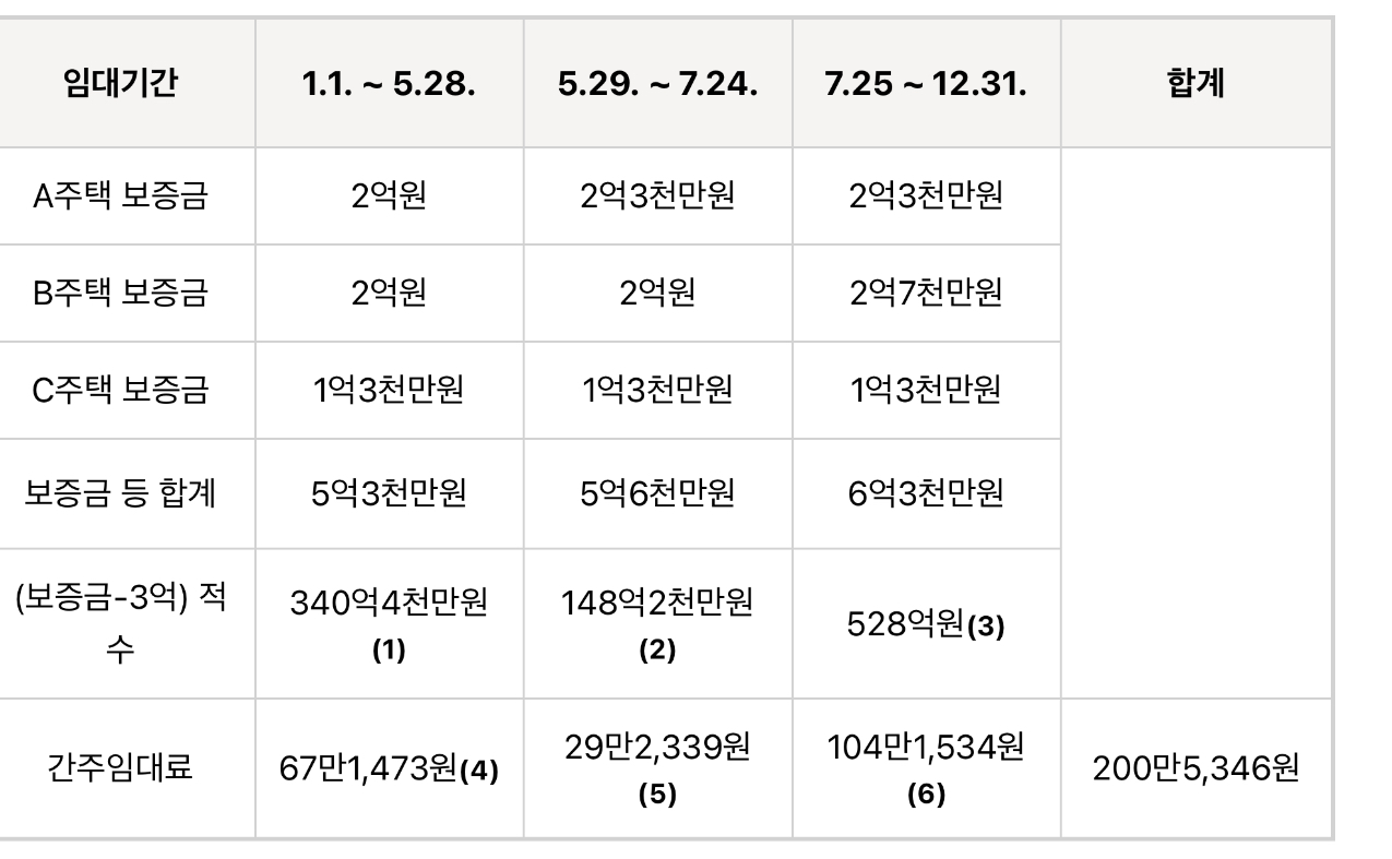 → 각 기간의 보증금 등의 합계액에서 주택의 임대보증금 적수가 큰 순서대로 3억원을 차감하여 계산된 각 기간별 간주 임대료를 합산하여 해당기간의 간주임대료를 계산합니다.