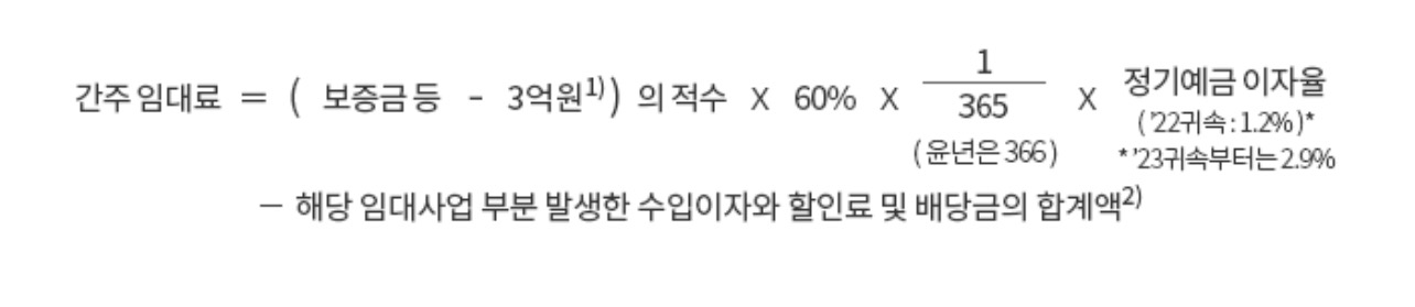 ➡️부부합산 비소형주택 3채 이상 소유자의 비소형주택 보증금 및 전세금에 대해서 보증금합계 3억 초과분의 60%에 대하여 1.2%를 임대료로 간주하여 총수입금액에 산입 합니다.
