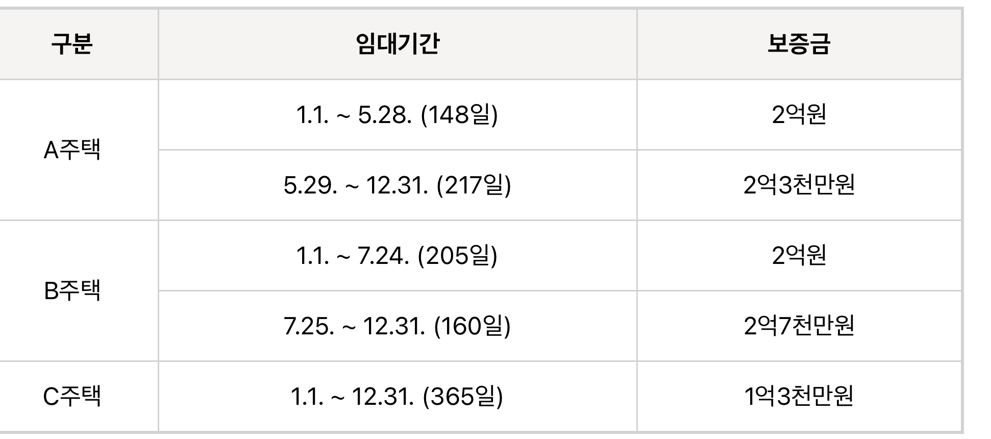 A,B,C 비소형주택 3채를 단독으로 임대 임대사업부분 발생 금융수익은 없으며, A B 주 택은 아래와 같이 임대기간별로 보증금이 변동 됐습니다.