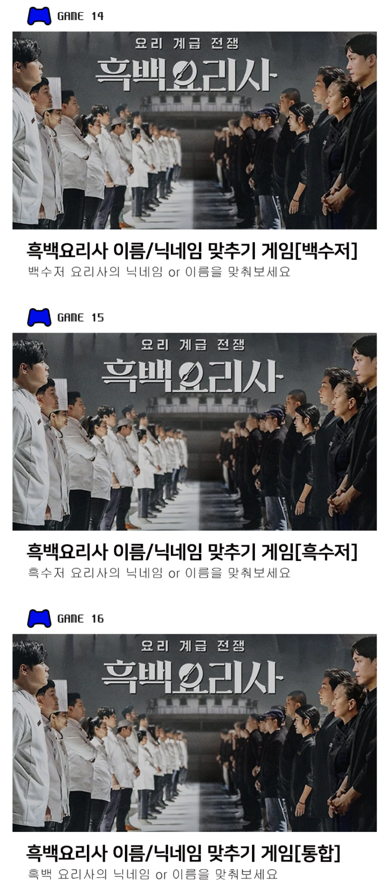 시작을 하면 백수저, 흑수저 쉐프 요리사들이 나오는데 사진을 보고 정답을 입력해 주시면 됩니다.