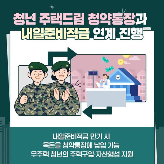 내일준비적금 만기 시 목돈을 청약통장에 납입 가능하고, 무주택 청년의 주택구입·자산형성을 지원합니다.