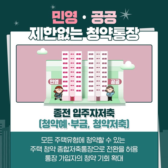 종전 입주자저축(청약예·부금, 청약저축)의 모든 주택유형에 청약할 수 있는 주택 청약 종합저축통장으로 전환을 허용해 통장 가입자의 청약 기회 확대합니다.
