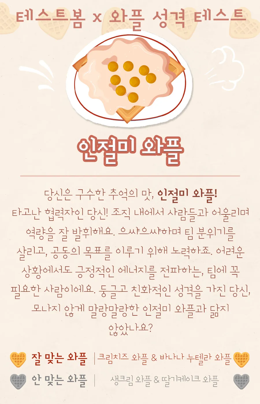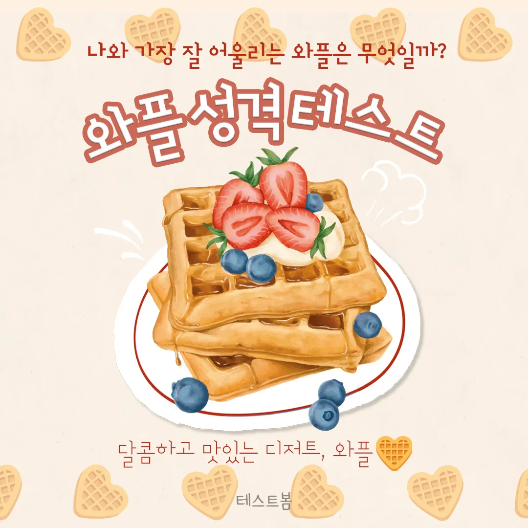 나와 가장 잘 어울리는 와플은 무엇일까를 알아보는 테스트봄에서 나온 ‘와플 성격 테스트’를 소개드리겠습니다.