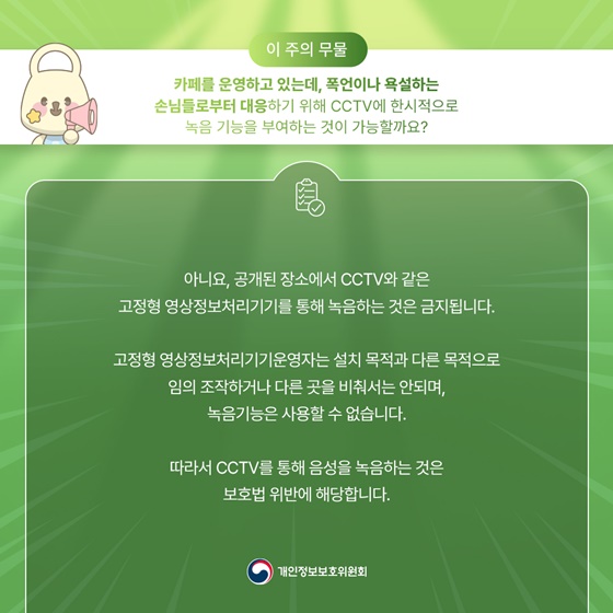 Q. 카페를 운영하고 있는데, 폭언이나 욕설하는 손님들로부터 대응하기 위해 CCTV에 한시적으로 녹음 기능을 부여하는 것이 가능할까요?