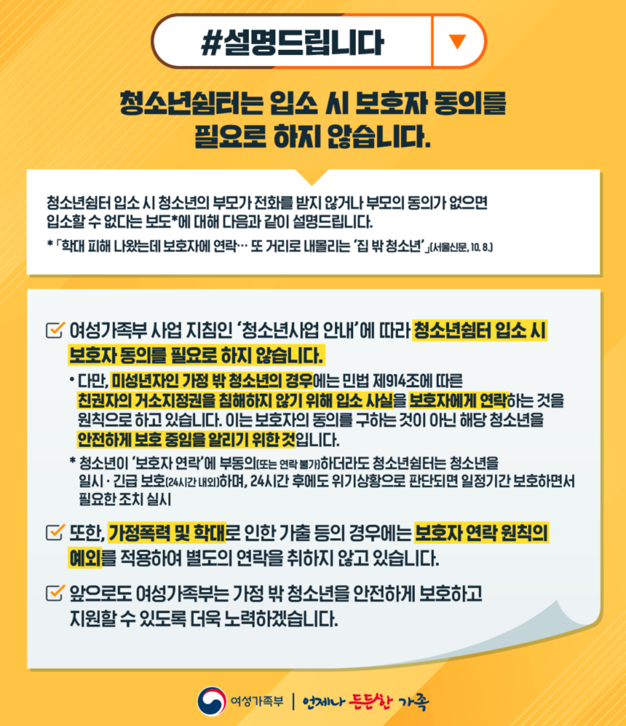 청소년쉼터 입소 시 청소년의 부모가 전화를 받지 않거나 부모의 동의가 없으면 입소할 수 없다는 보도*에 대해 다음과 같이 설명드립니다.