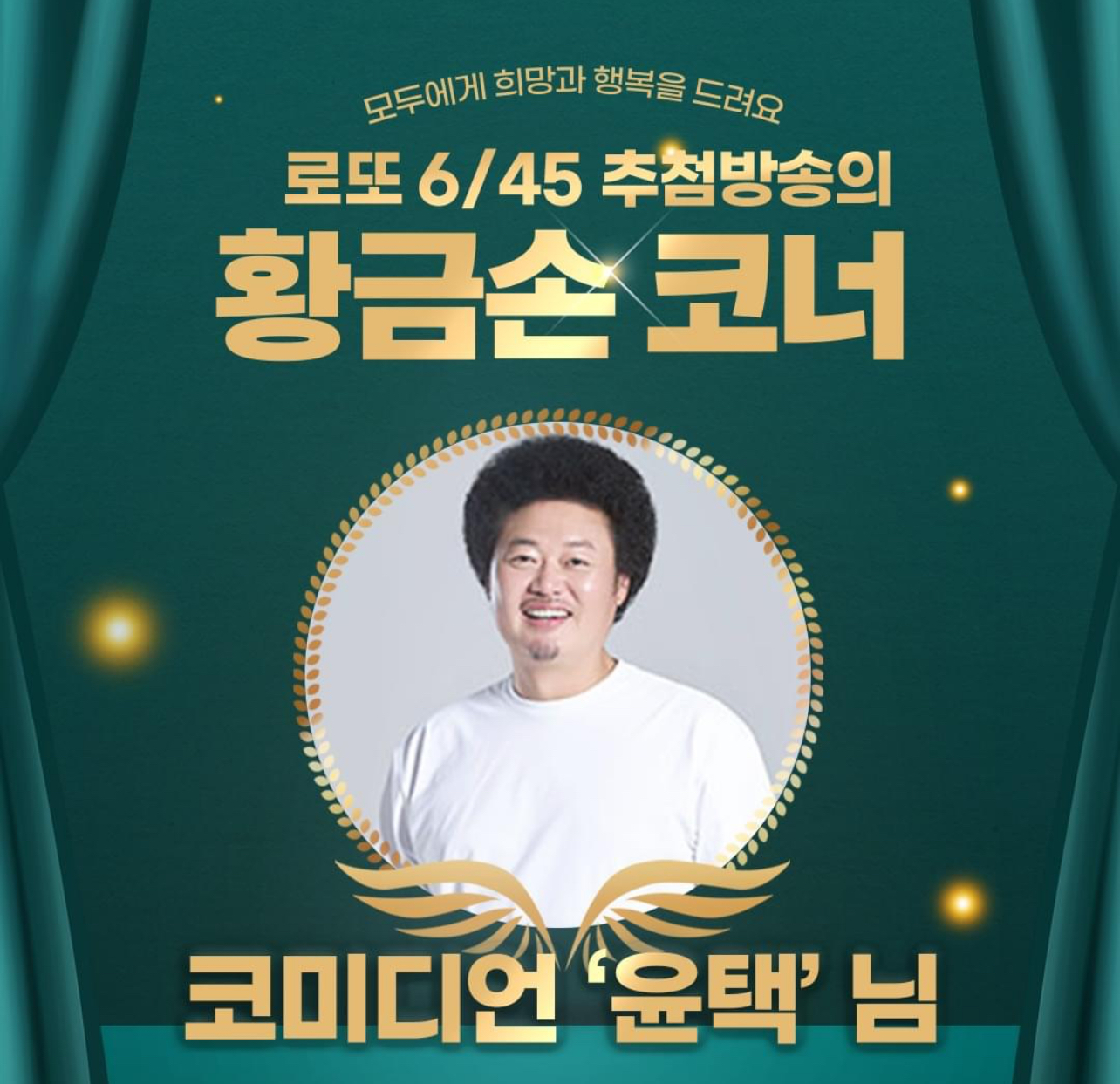 코미디언 윤택이 1,141회 MBC ‘생방송 행복드림 로또 6/45’ ‘황금손’으로 출연한다고 합니다.