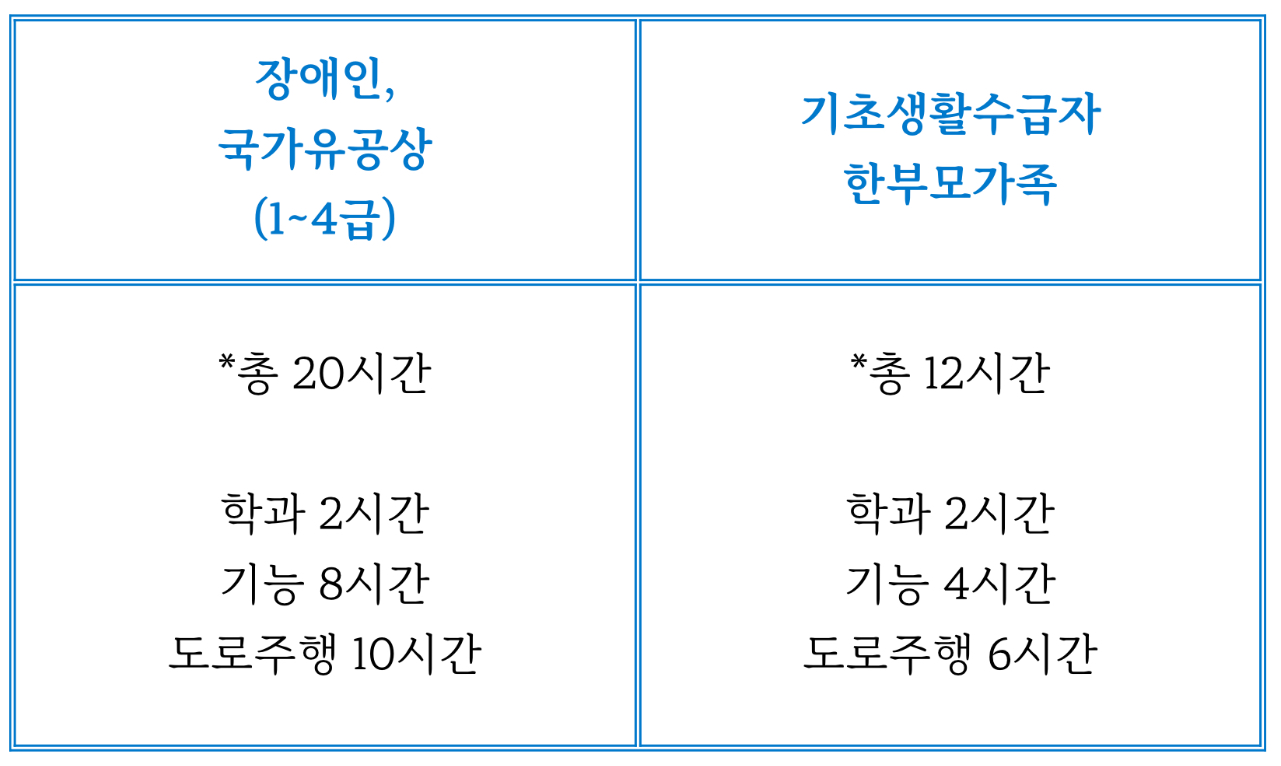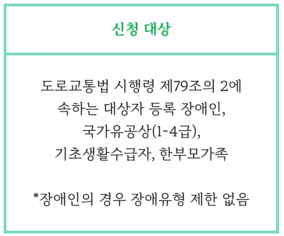 도로교통법 시행령 제79조의 2에 속하는 대상자 등록 장애인, 국가유공상(1~4급), 기초생활수급자, 한부모가족