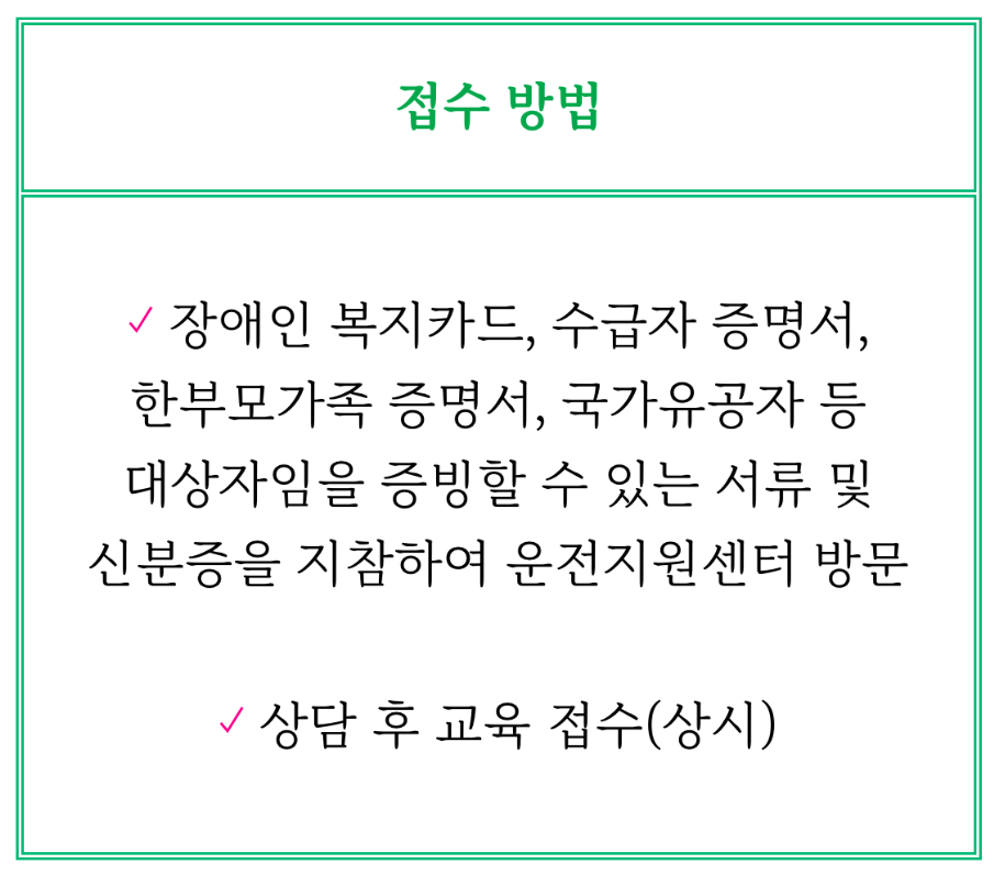 ✓ 장애인 복지카드, 수급자 증명서, 한부모가족 증명서, 국가유공자 등 대상자임을 증빙할 수 있는 서류 및 신분증을 지참하여 운 전지원센터 방문