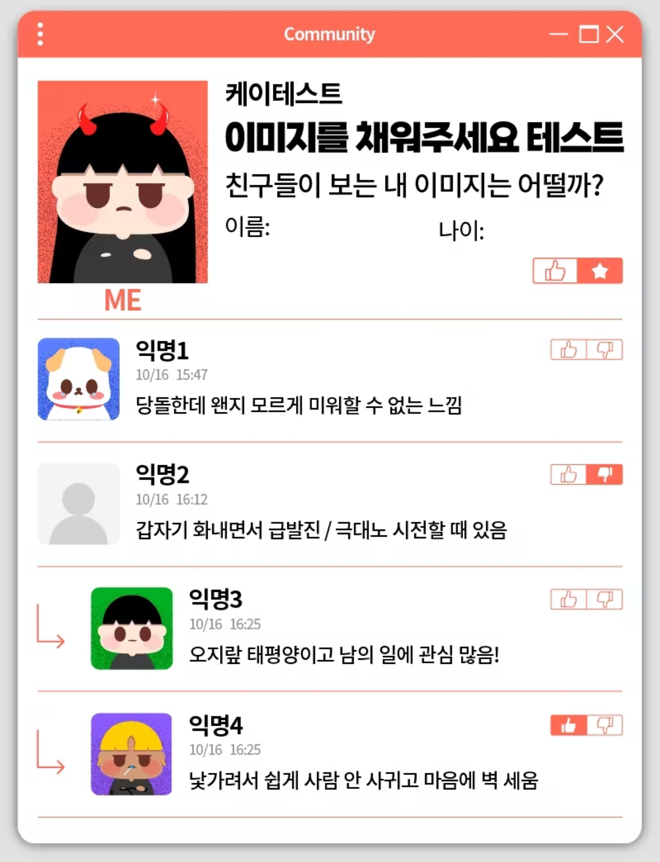 친구들이 보는 내 이미지는 어떨지 알아보는 케이테스트에서 나온 ‘이미지를 채워주세요 성격 테스트’를 소개드리겠습니다.