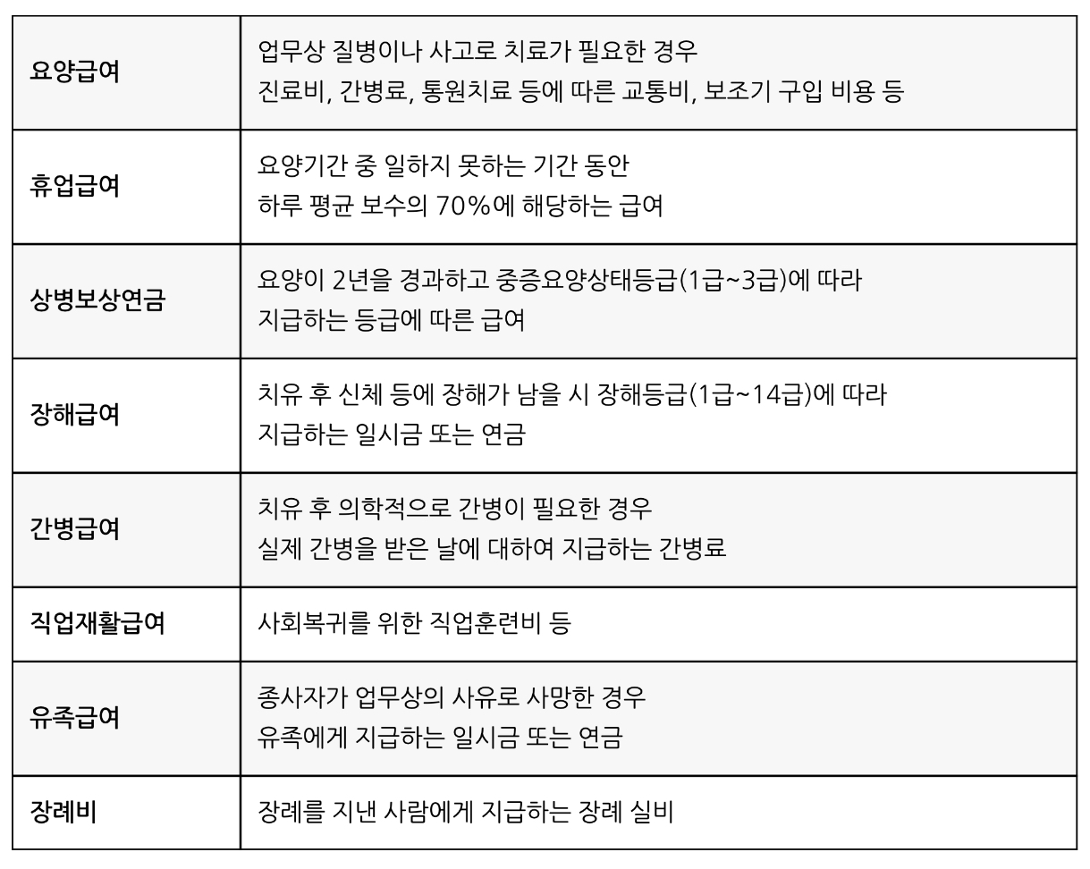 • 요양급여: 업무상 질병이나 사고로 치료가 필요한 경우 진료비, 간병료, 통원치료 등에 따른 교통비, 보조기 구입 비용 등